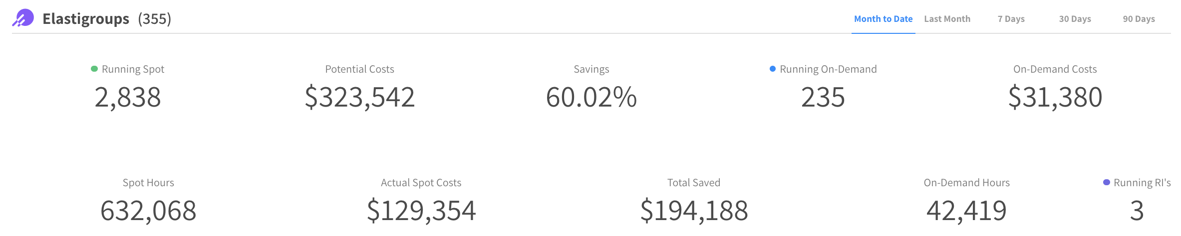 A summary line at the top of the dashboard provides a quick overview of your account, including the total number of Elastigroups in the account. The default display shows statistics from the first of the current month to the current date. You can change the view to show data from last month, the last seven days, the last 30 days, or the last 90 days.